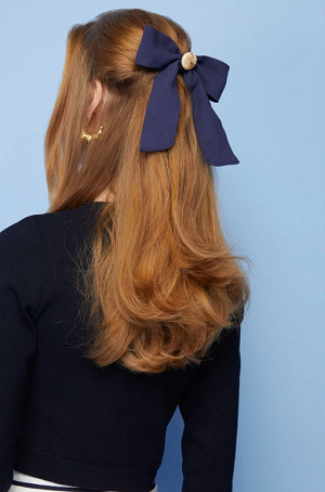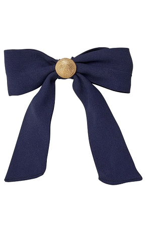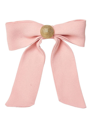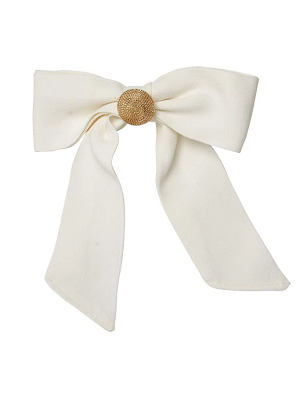The Sara dowel is a tailor made in crepe patou fabric. The bow-shaped accessory has a golden metal button in the middle, providing romanticism and delicacy to the look.