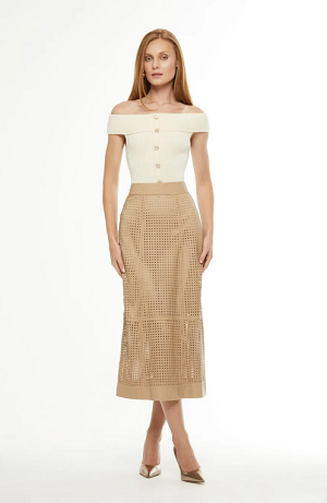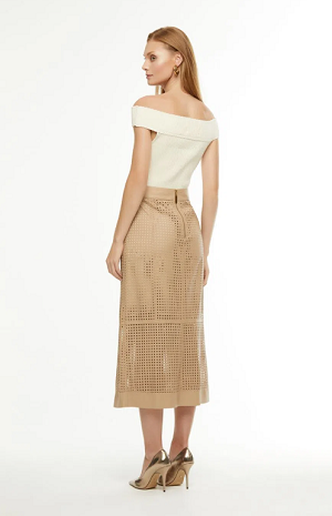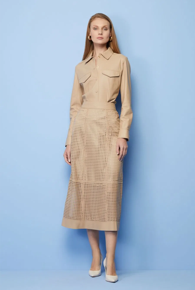 The Gabi skirt is made of leather. The piece features a straight fit with holes made from the fabric itself, providing a modern and elegant look. It features a long length, a high rise, a loose lining, a metal back zipper and a top-stitched finish. Care is recommended when washing the piece, as it is a delicate fabric.