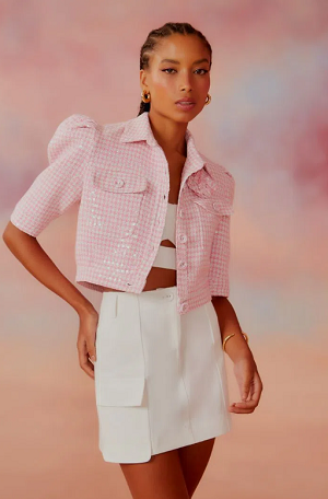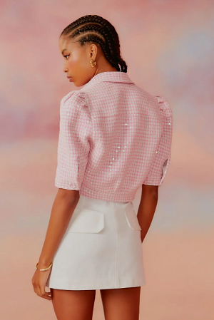 Cropped jacket with puffed sleeves and covered buttons. Pink worked tweed, all embroidered with mini sequin flowers. Flower brooch detail, can be worn with or without. Super sweet piece with super different fabric.